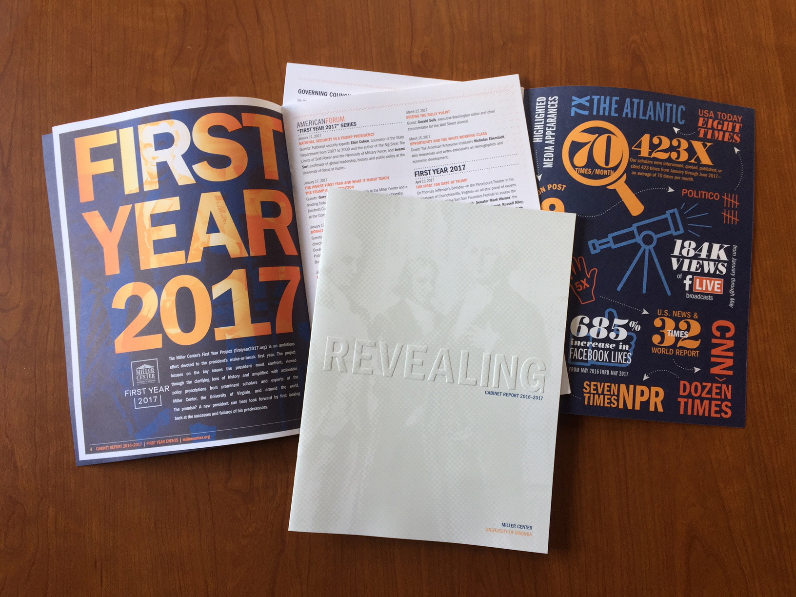 Miller Center Annual Report. The Miller Center's focus last year was on Presidential first year in office.. The imagery used on the cover is taken from a painting depicting George Washington's inauguration. Cover printing techniques: blind emboss and UV spot varnish. One of the brand attributes is "Revealing Democracy" so that is an underlying theme throughout much of our work.